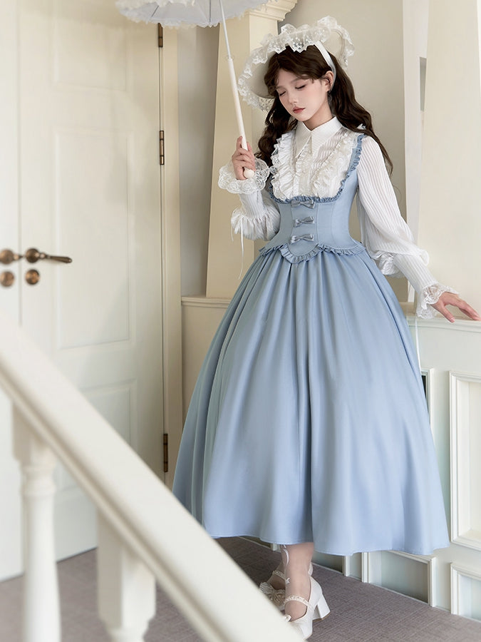 Blau-weißes Old School Lolita Fashion Kleid mit Schleife und Details, JSK-Set