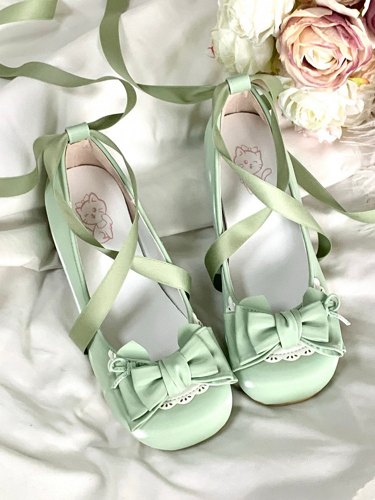 Sweet Green 3.5 cm Heeled Ballet Shoes for Lolita - Bow at Top & Wrap-Around Ankle Tie