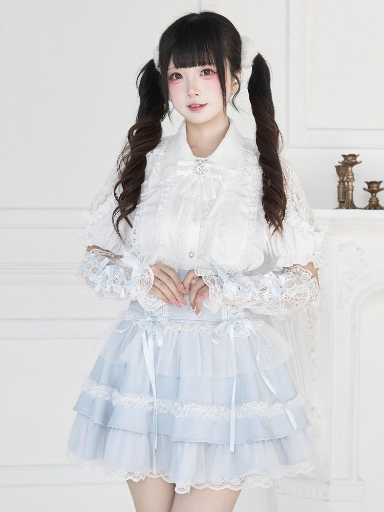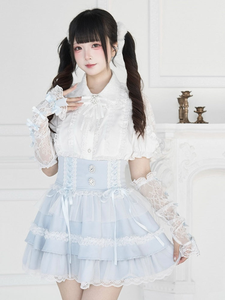 Blau-weißes Old School Lolita Fashion Kleid mit Schleife und Details, JSK-Set