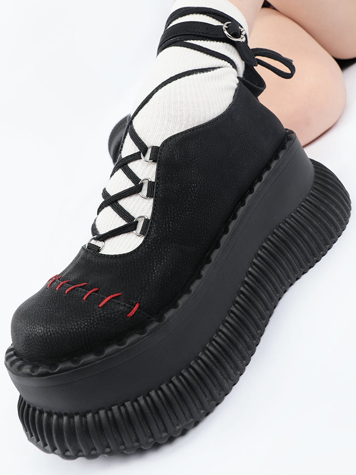 Schwarze Mary Janes mit Plateausohle – rote Kontrastnähte mit überkreuztem Schnürverschluss
