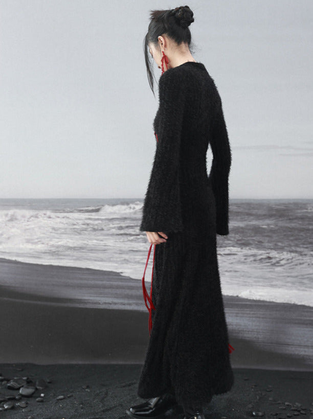 Dieses Kontrastkleid besticht durch ein wunderschönes Rosenstrickmuster auf dunkelschwarzem Stoff und sorgt für einen einzigartigen und auffälligen Look. Die Glockenärmel verleihen dem Kleid einen besonderen Charme und machen es zu einer schönen Ergänzung für jede Garderobe.
