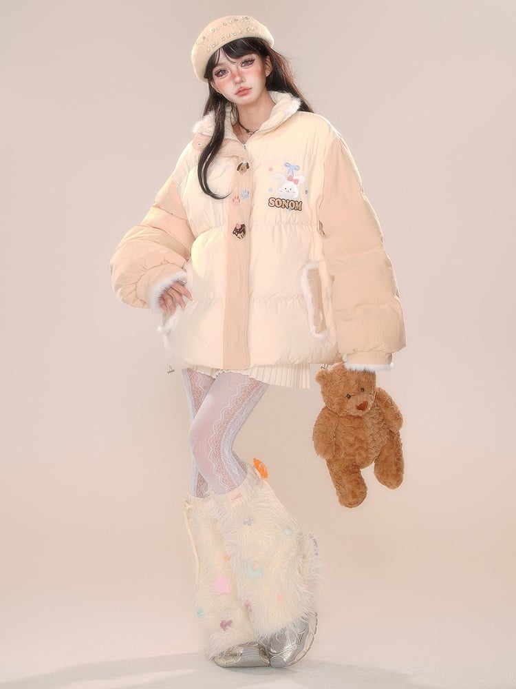 Cremegelbe Pufferjacke mit süßem Häschen-Plüschbesatz