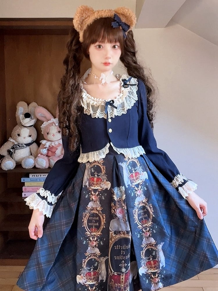 Blau-weißes Old School Lolita Fashion Kleid mit Schleife und Details, JSK-Set