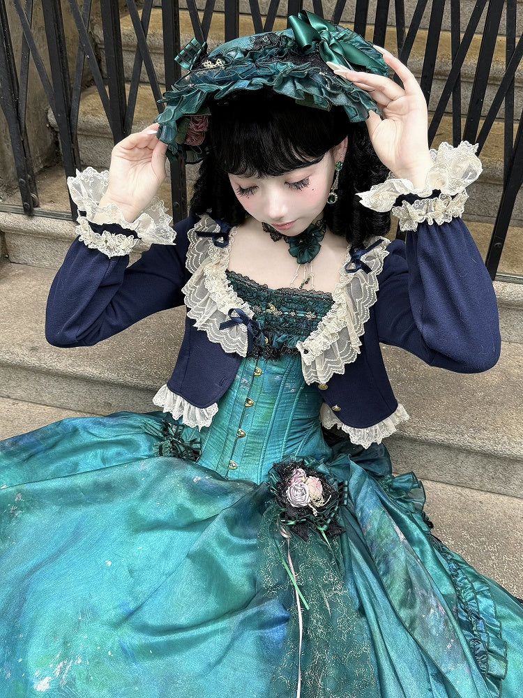 Dunkelblauer Lolita Fashion Cropped Cardigan mit Spitzenbesatz und Schleife