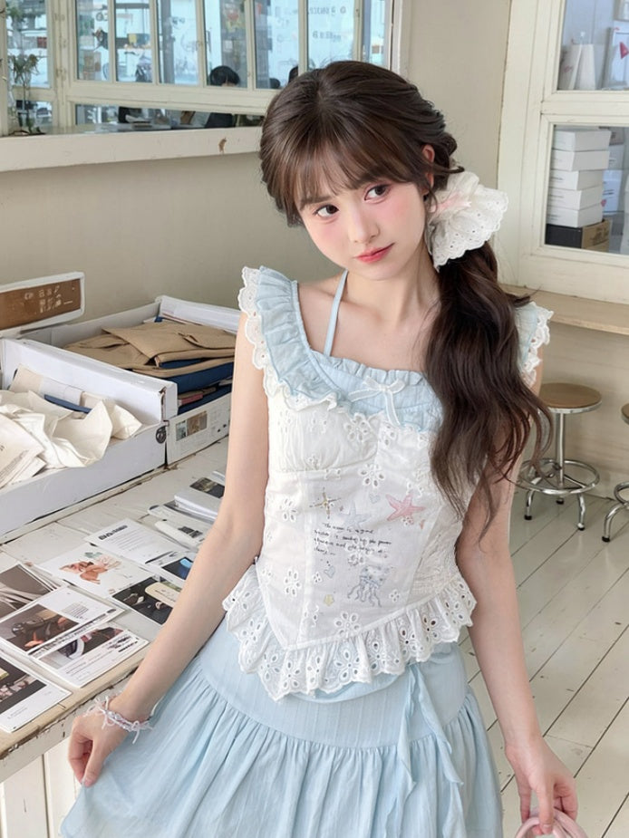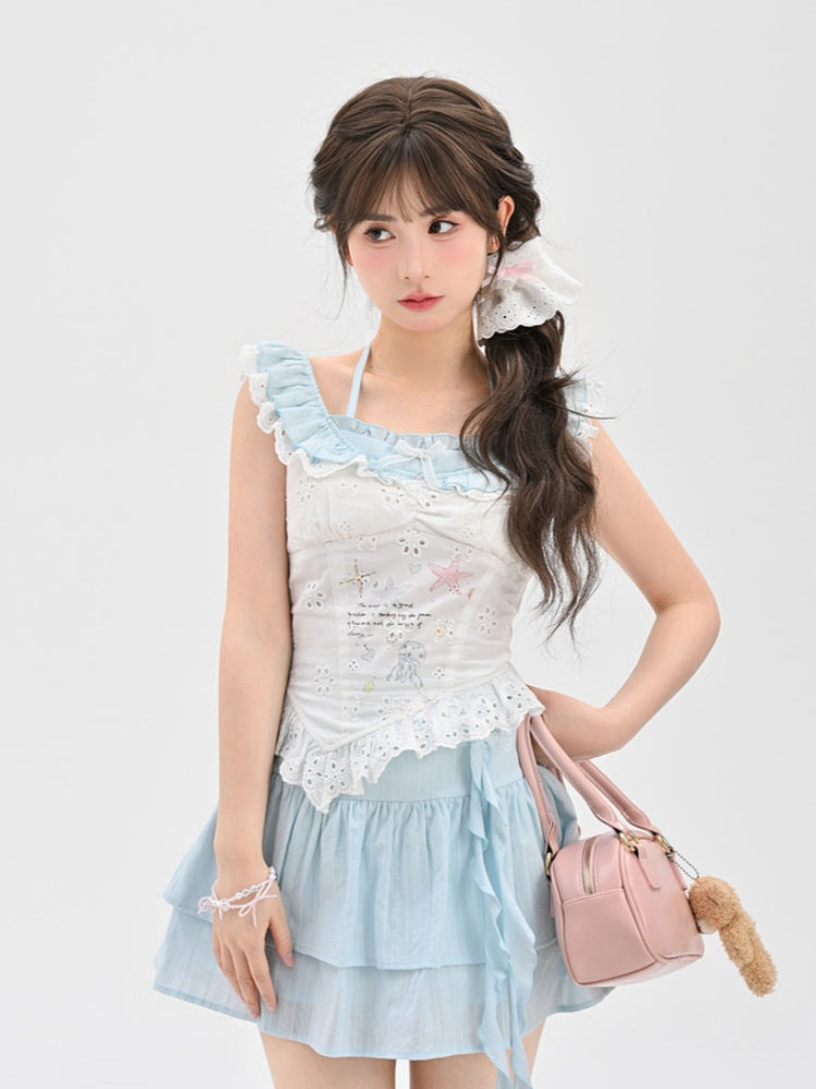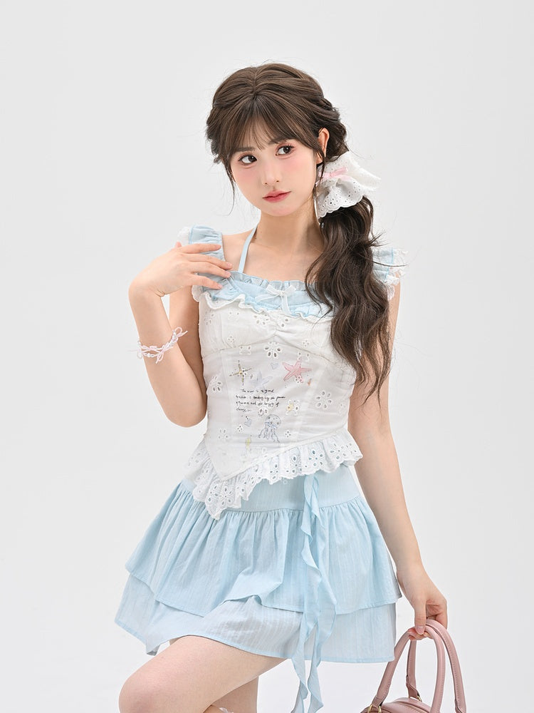 Ärmelloses Top mit gebogenen Ärmeln, weißem Saum, Seestern- und Quallen-Graffiti-Flatter