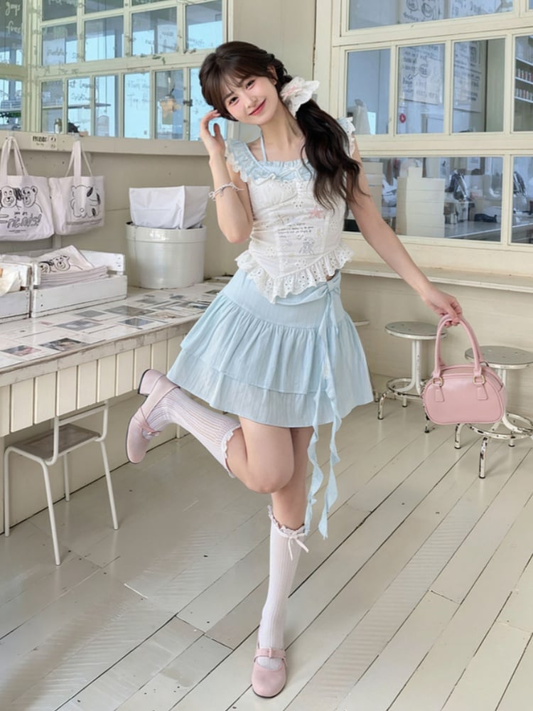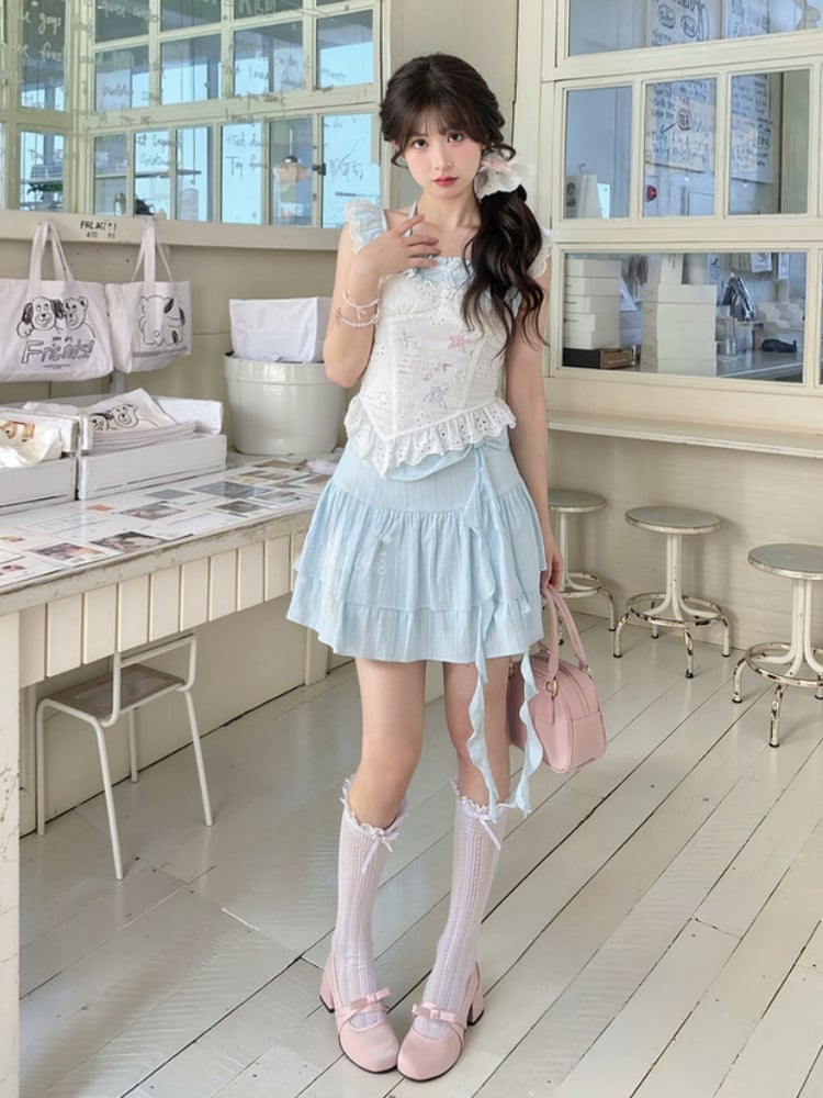 Blau-weißes Old School Lolita Fashion Kleid mit Schleife und Details, JSK-Set