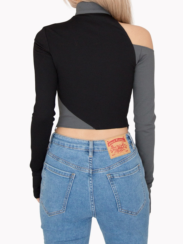 Cyberpunk Schwarz & Grau Stehkragen Cutout Detail Asymmetrischer Saum Glamouröses Top