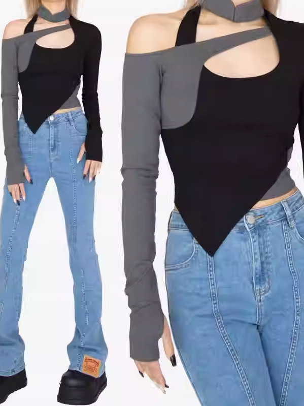 Rocke deinen coolen Style mit unserem Cyberpunk Black & Grey Top! Der Stehkragen und der asymmetrische Saum verleihen einen Hauch von Glamour, während das Cut-Out-Detail für einen einzigartigen Twist sorgt. Perfekt für einen Abend oder jeden anderen Anlass – dieses Top lässt dich mit seinem coolen und süßen Design auffallen.