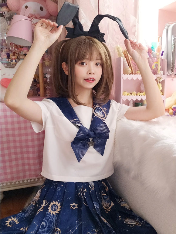 Dunkelblaues Matrosenkragen-Oberteil mit Himmelskugel-Print und weißem JK-Uniform-Oberteil