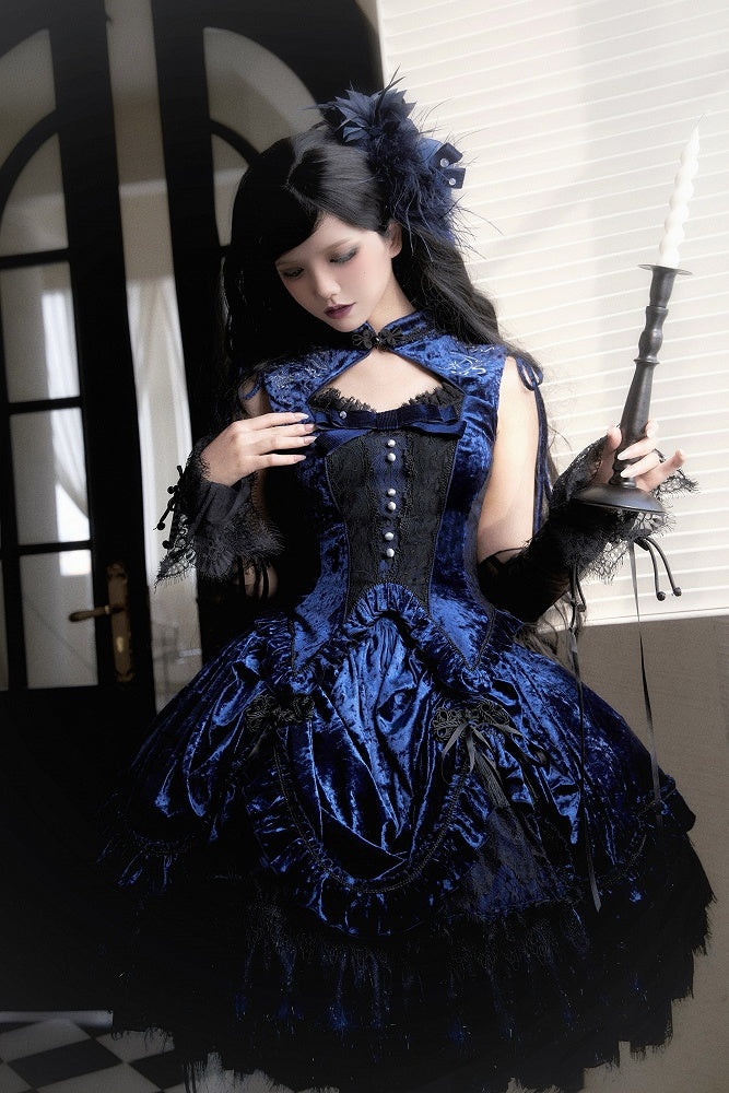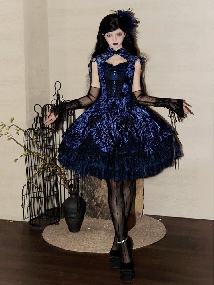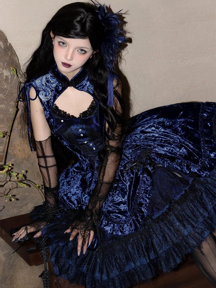 Dunkelblaues ärmelloses Oberteil aus Samt mit Cheongsam-Kragen und Schlangenknochen-Stickerei