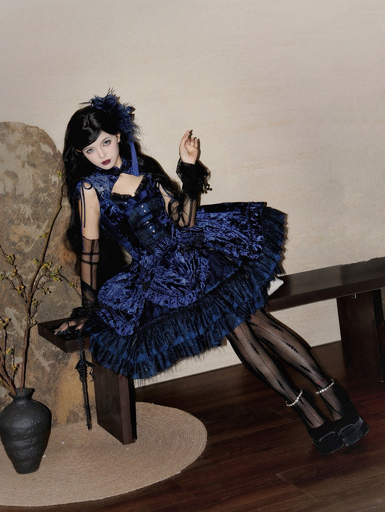 Blau-weißes Old School Lolita Fashion Kleid mit Schleife und Details, JSK-Set