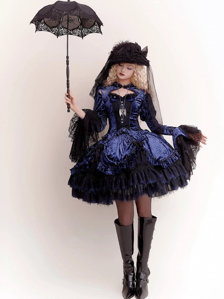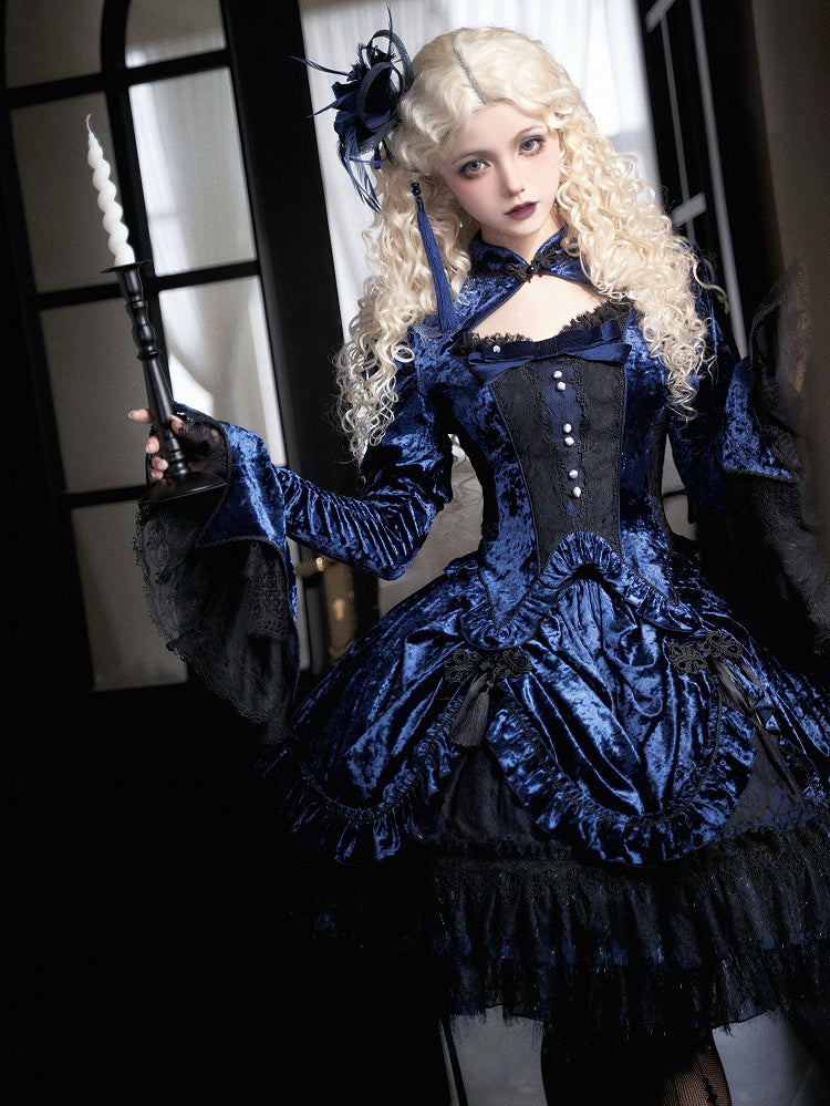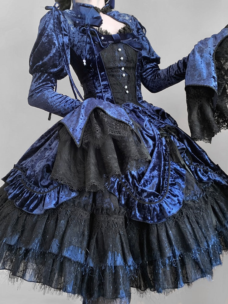 Blau-weißes Old School Lolita Fashion Kleid mit Schleife und Details, JSK-Set