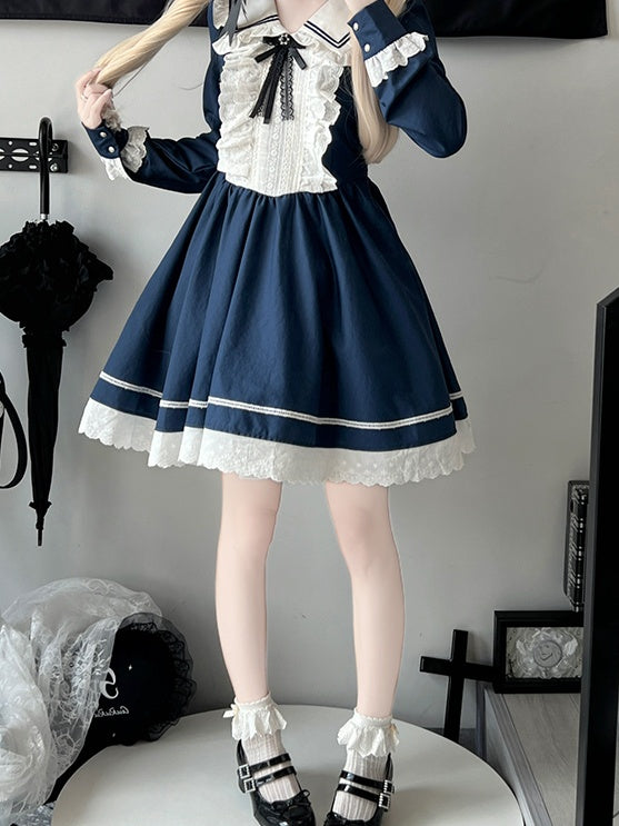Blau-weißes Old School Lolita Fashion Kleid mit Schleife und Details, JSK-Set