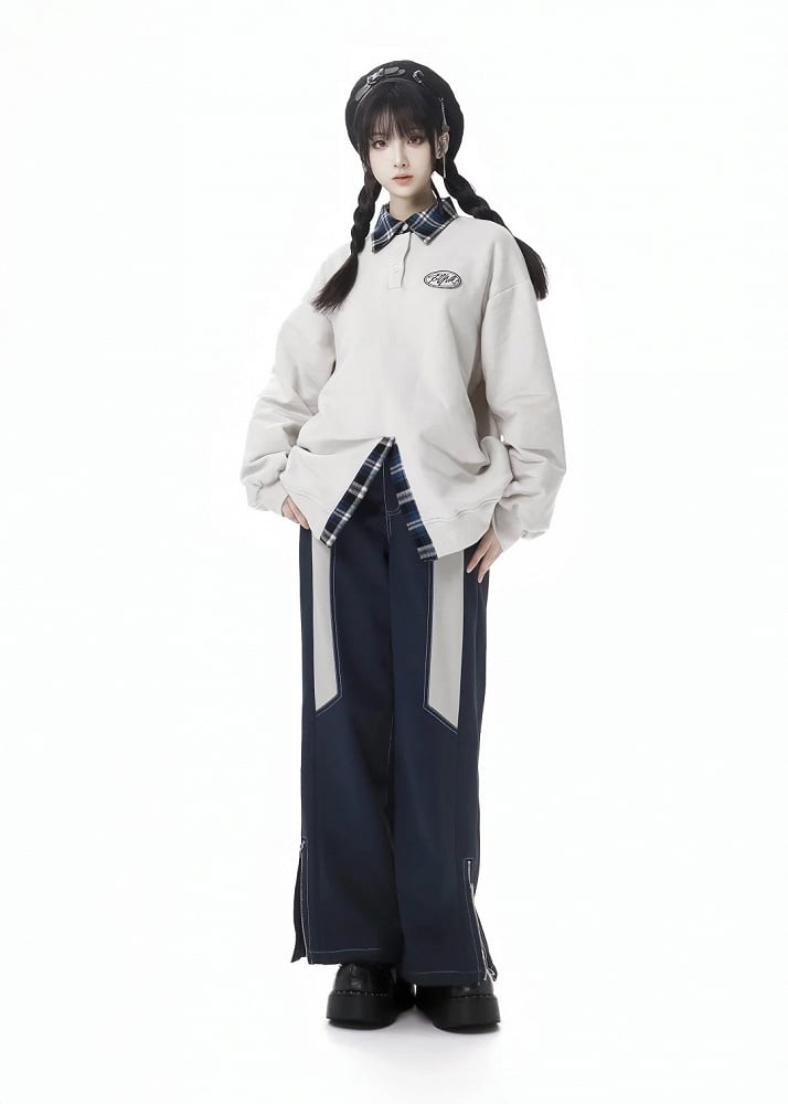Dunkelblaue und weiße Hose mit Reißverschlussbündchen