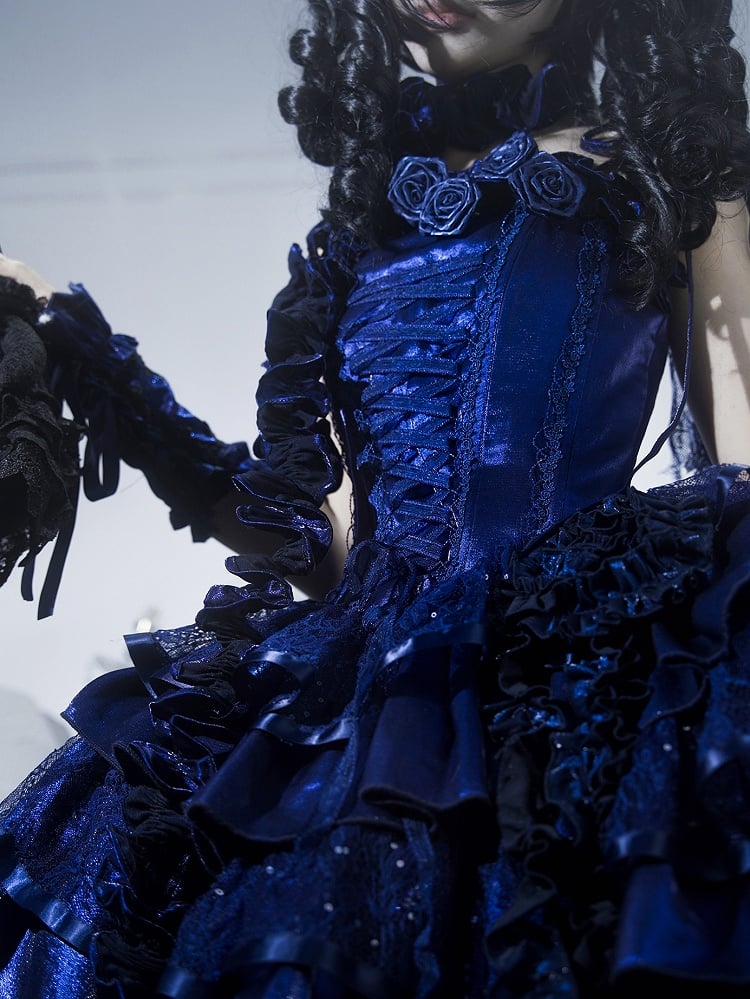 Blau-weißes Old School Lolita Fashion Kleid mit Schleife und Details, JSK-Set