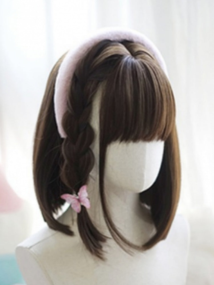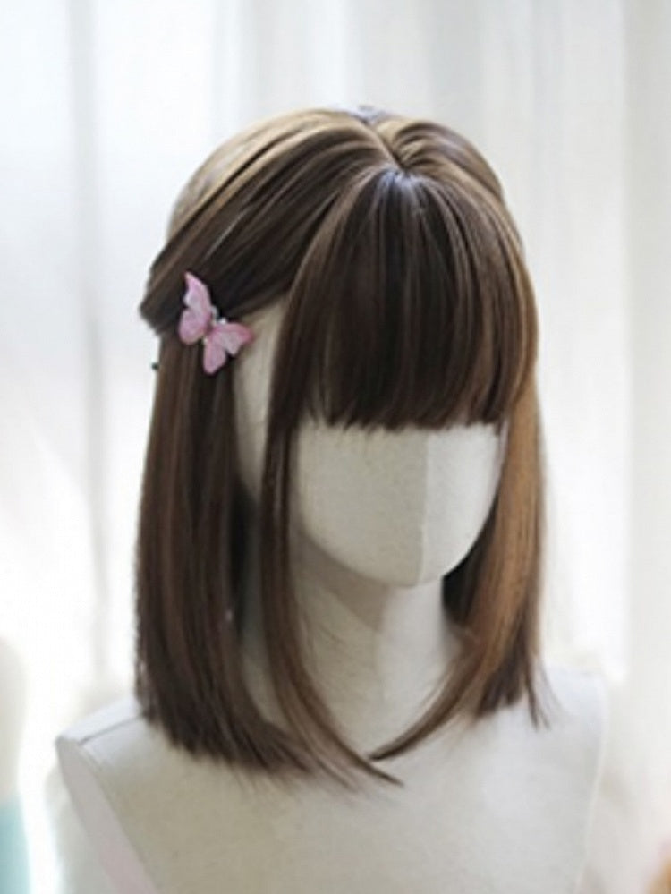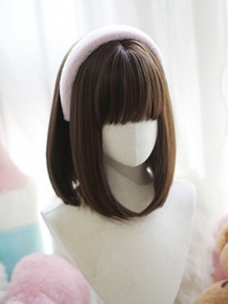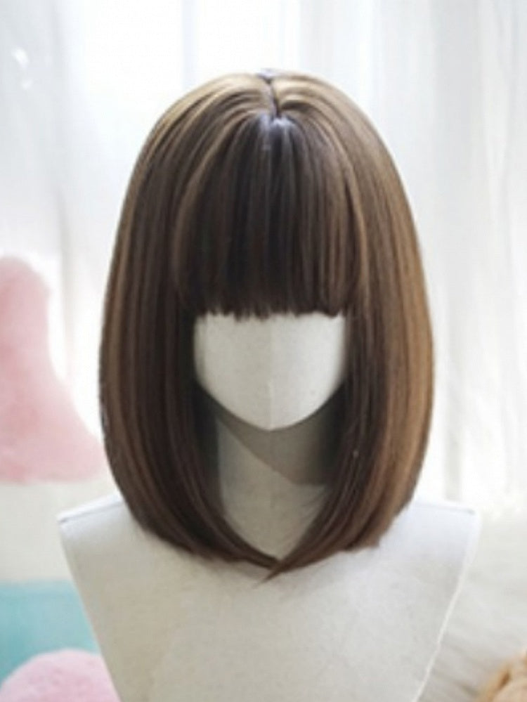 Dunkelbraune, schulterlange, glatte Perücke im Bob-Schnitt mit vollem Pony