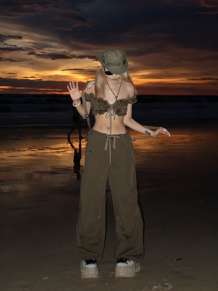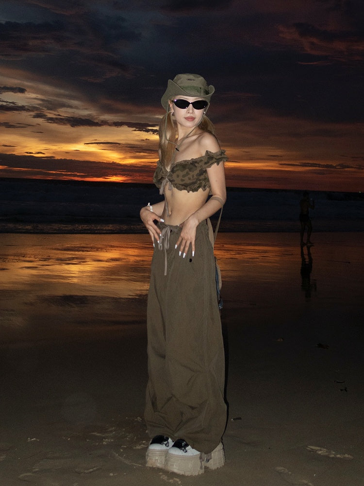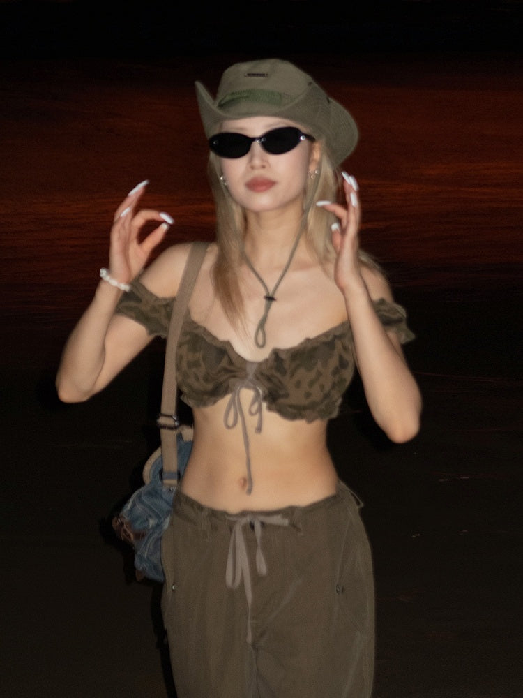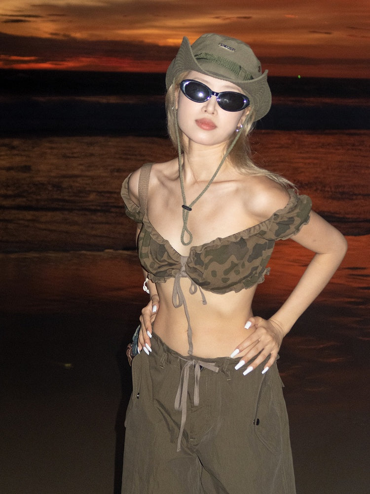 Dunkles Camouflage-Muster, Rüschenbesatz, kurze Puffärmel, glamouröses, kurzes, trägerloses Top