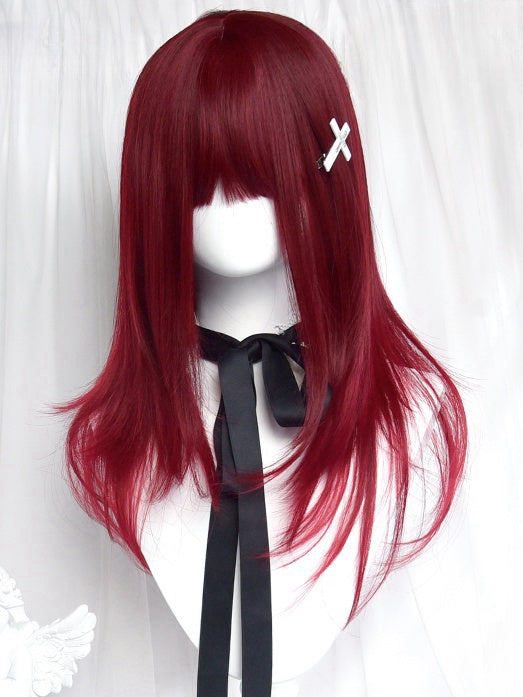Dunkelrote, über der Brust lange, glatte Perücke mit vollem Pony