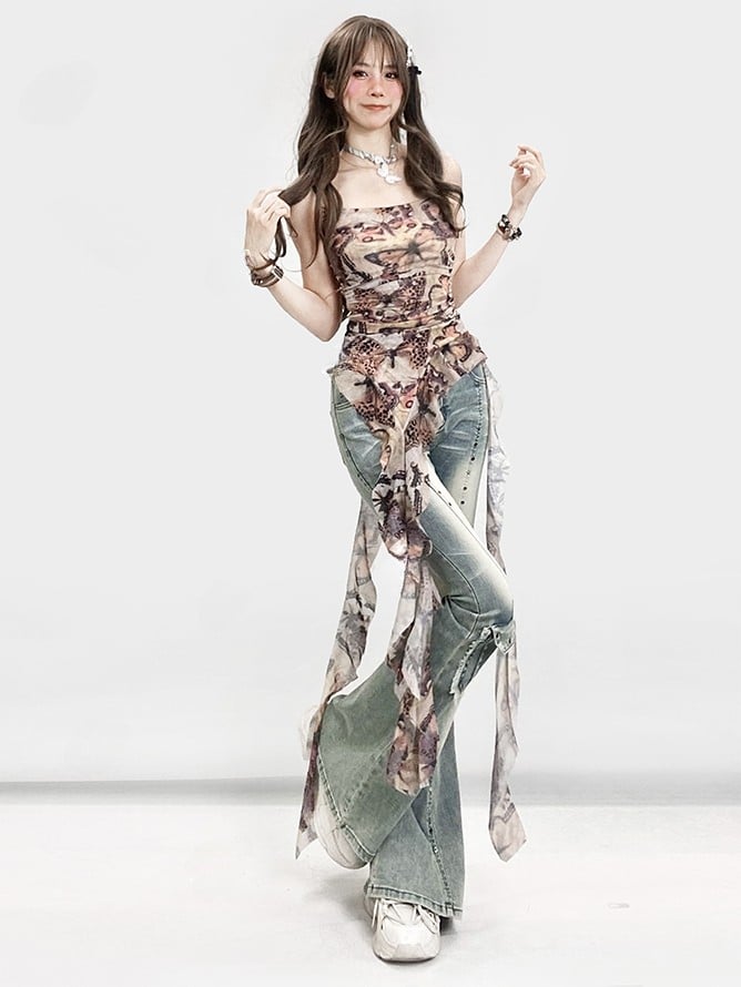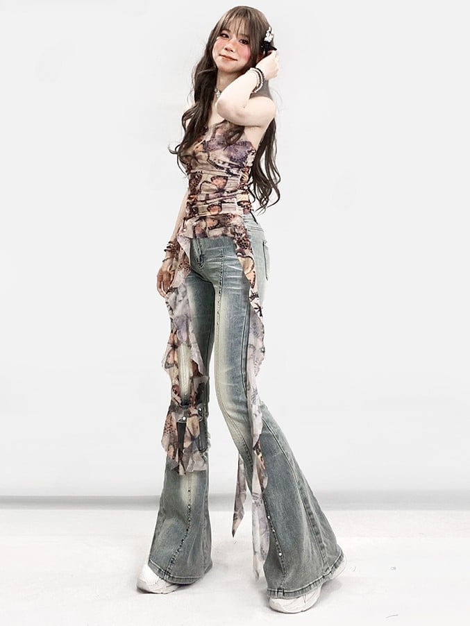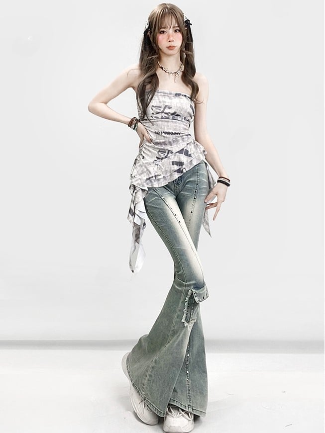 ● Knopfverschluss und Reißverschluss / Verblasste Waschung / Fischschwanzhose / Schlag-Silhouette / Rohe und ausgefranste Bündchen