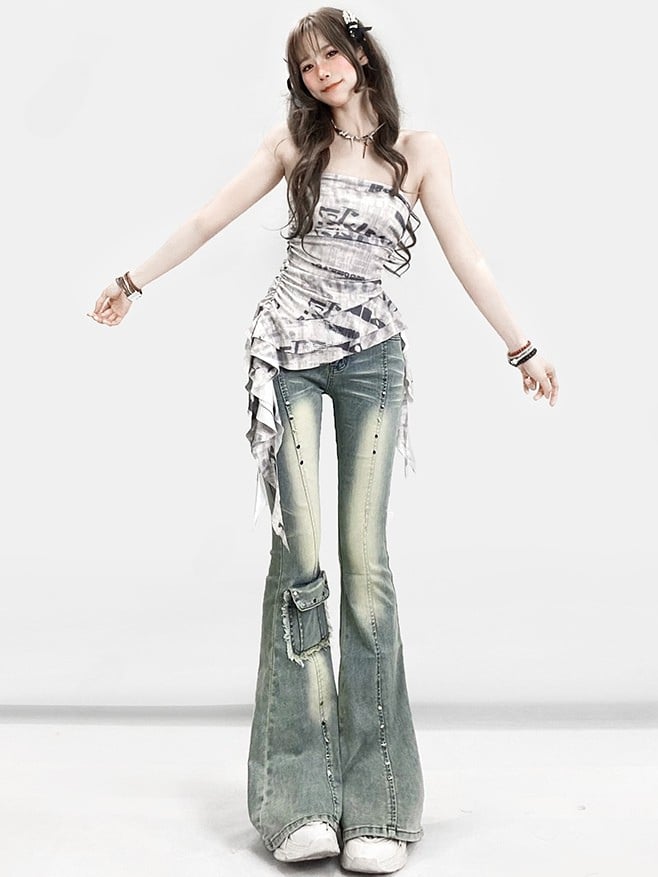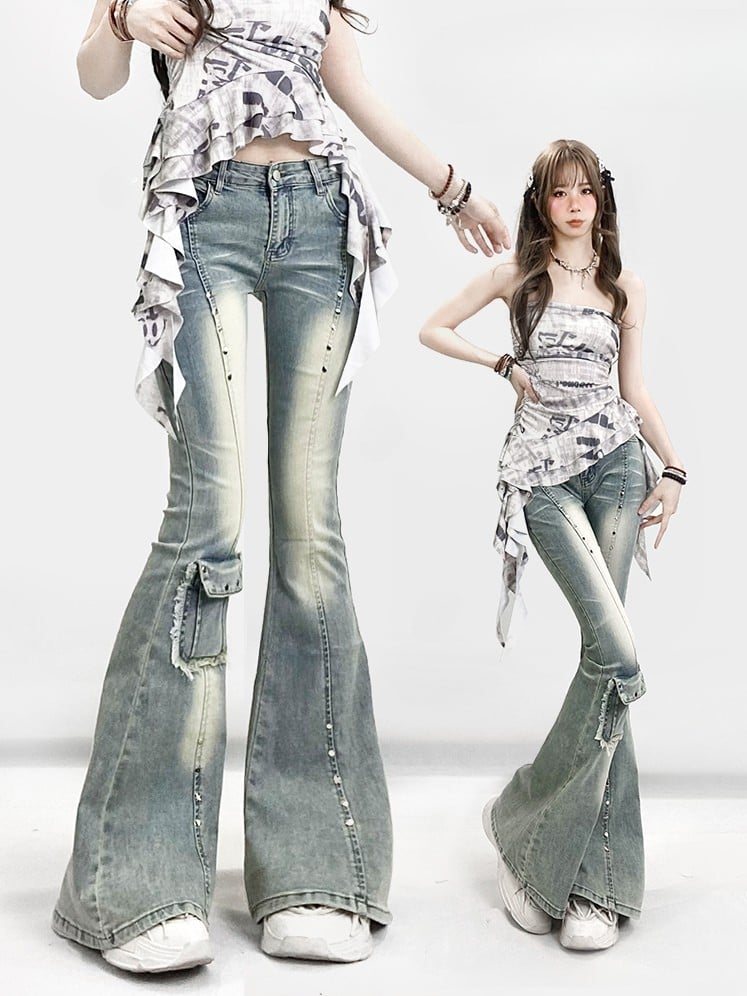 Blaue Y2K Glamouröse Faded Wash Rohe und ausgefranste Bündchen Taschenverzierte Flare Silhouette Jeans