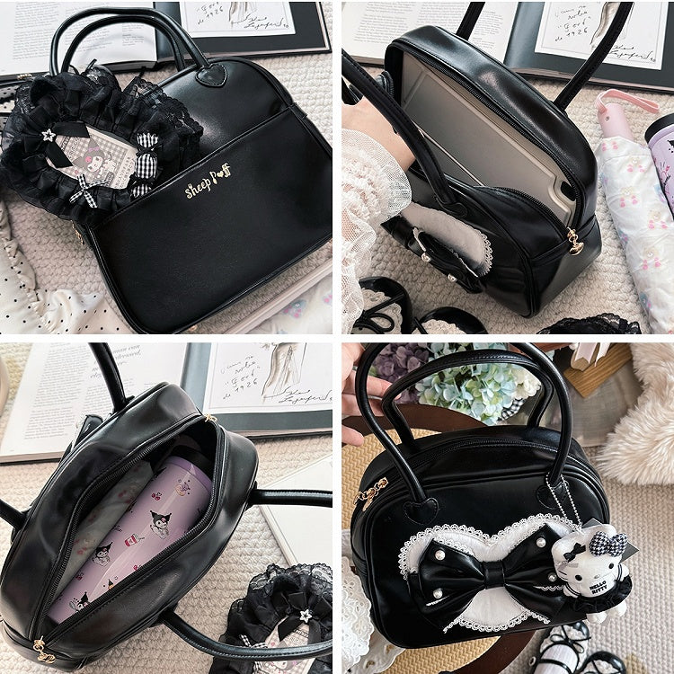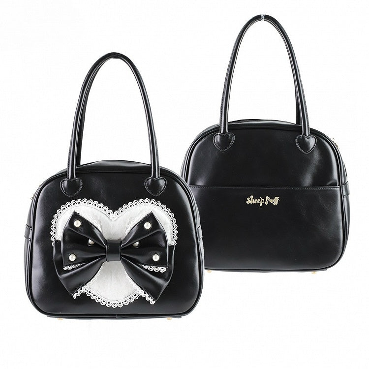 Schwarze süße Lolita-Handtasche aus Plüsch mit Herzperlen und Schleife