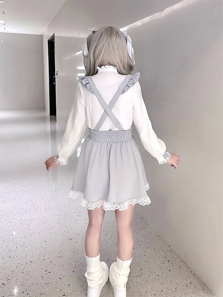 Jirai Kei – Staubblaues Overall-Kleid mit Flatterärmeln, Herzschnallen und dekorativen Perlenknöpfen