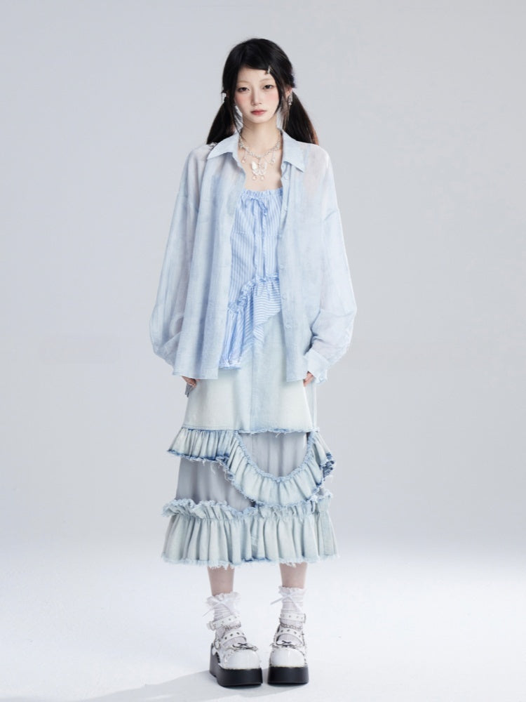 ● Knopfverschluss und Reißverschluss / Verblasste Waschung / Ausgefranster Saum / Rüschensaum / Gestufte Rüschen