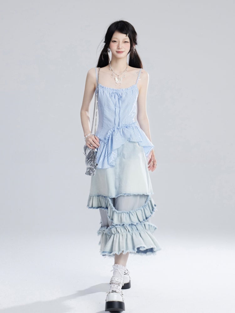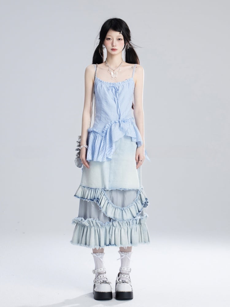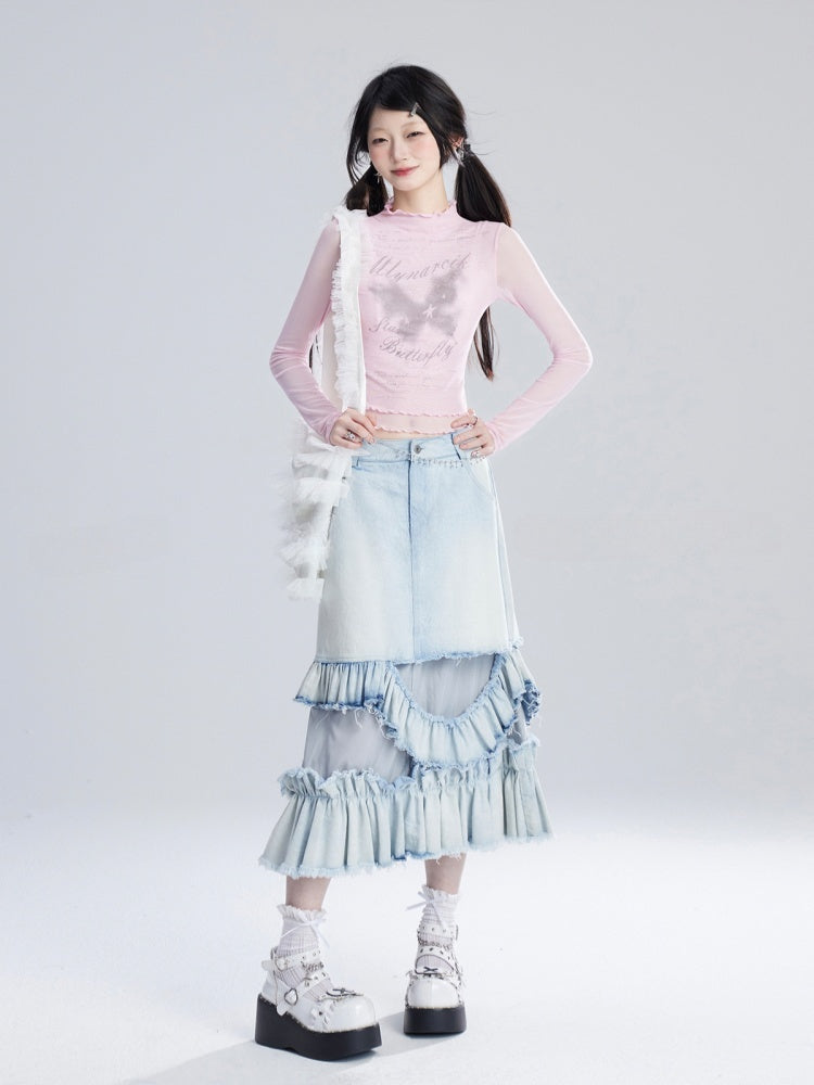 Blauer, niedrig taillierter, verblasster, verwaschener, gestufter, asymmetrischer Jeansrock mit Rüschen