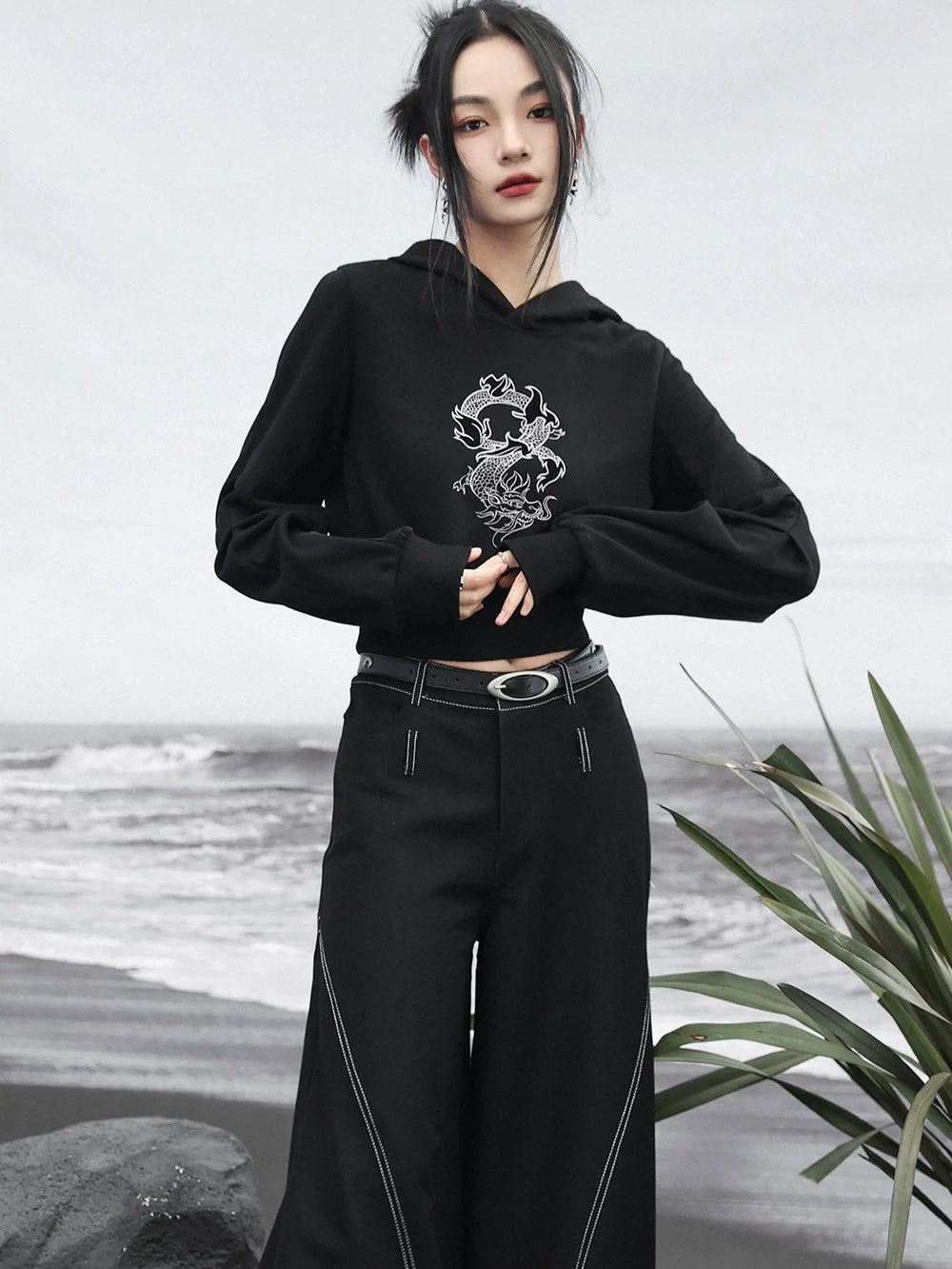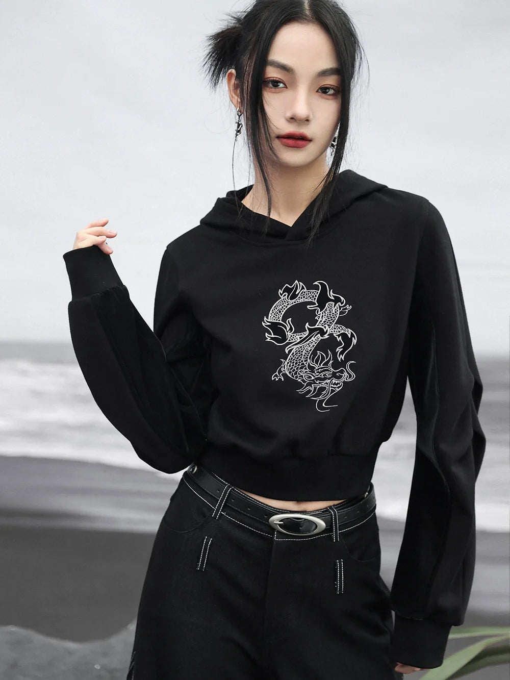 Mit unserem Design Short Hooded Dragon Top bist du stylisch und süß. Das einzigartige Drachen-Design verleiht jedem Outfit einen Hauch von Verspieltheit. Die kurze Kapuze und die bequeme Passform machen es zu einem Must-have für alle modebewussten Damen.