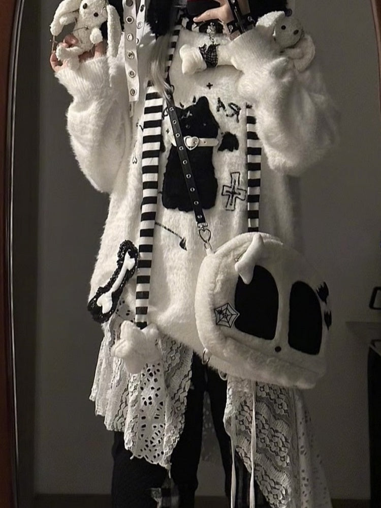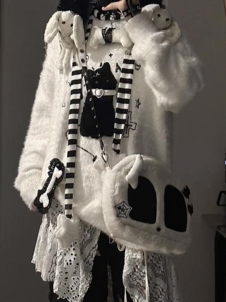 Detail Katzengürtel Pullover Kragen Strick Flockstickerei - Kawaii Weiß/Schwarz