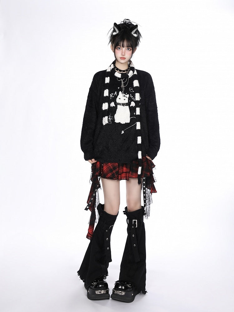 Weiß/schwarzer Kawaii-Strickpullover – beflockte Katzenstickerei und Kragengürteldetail