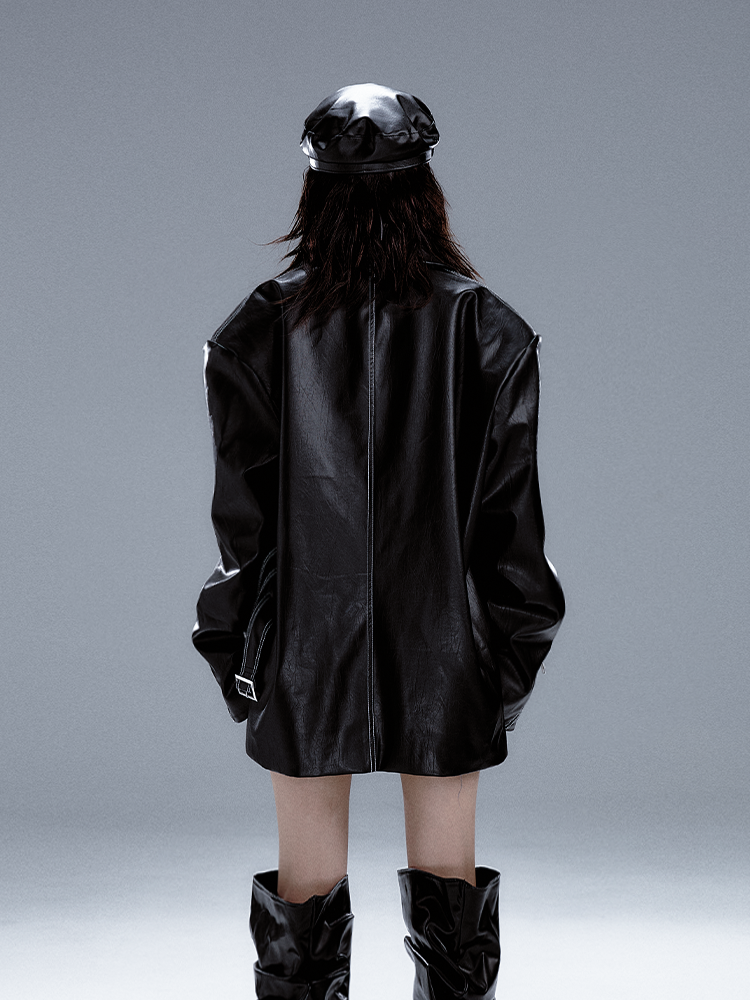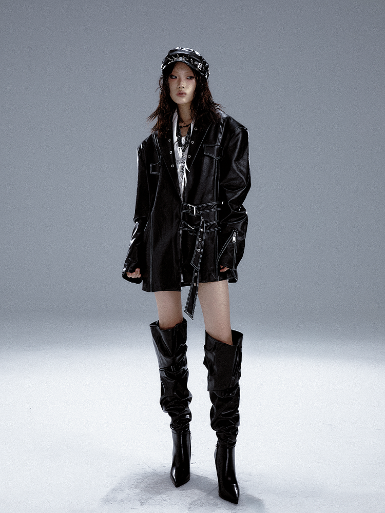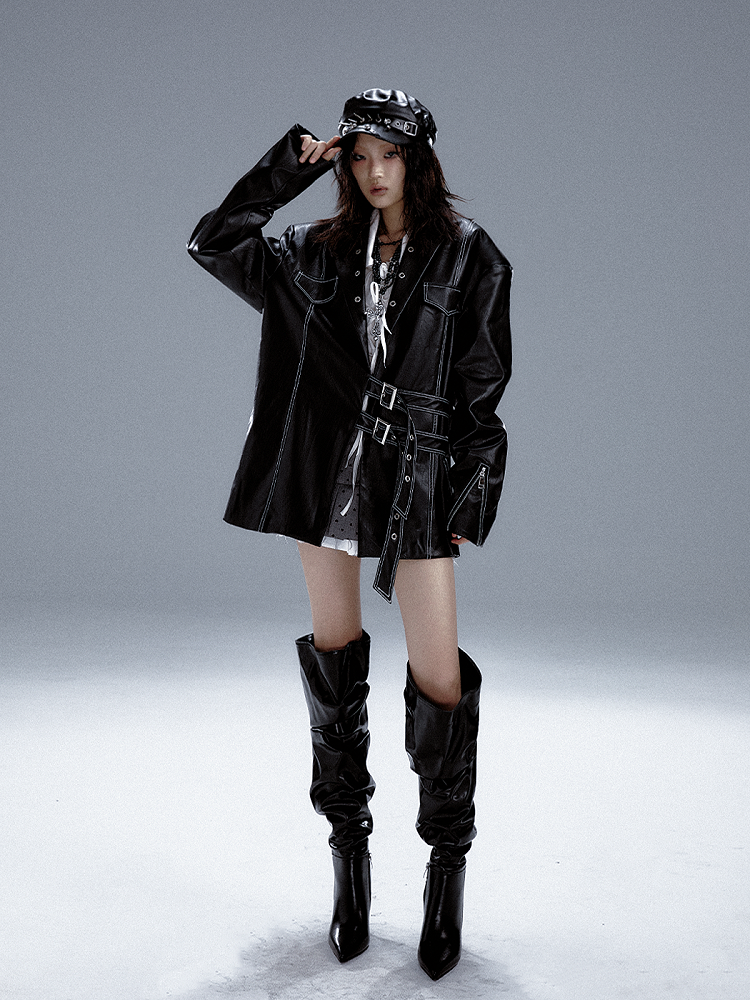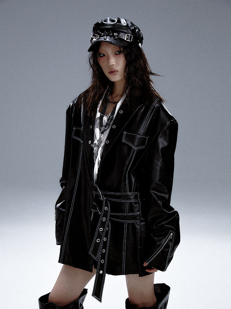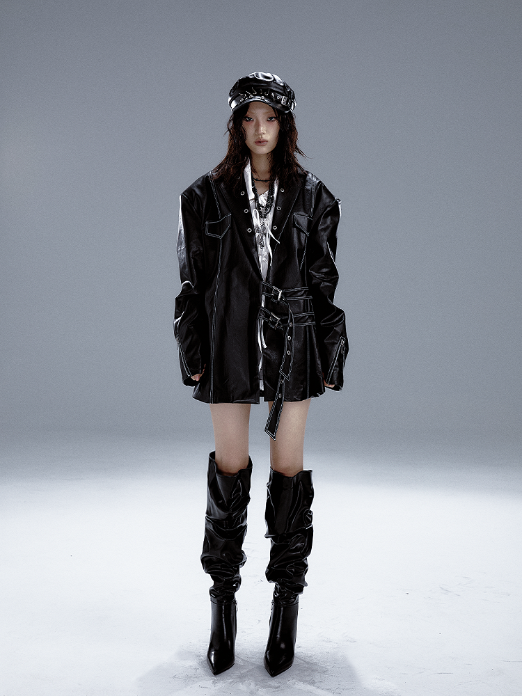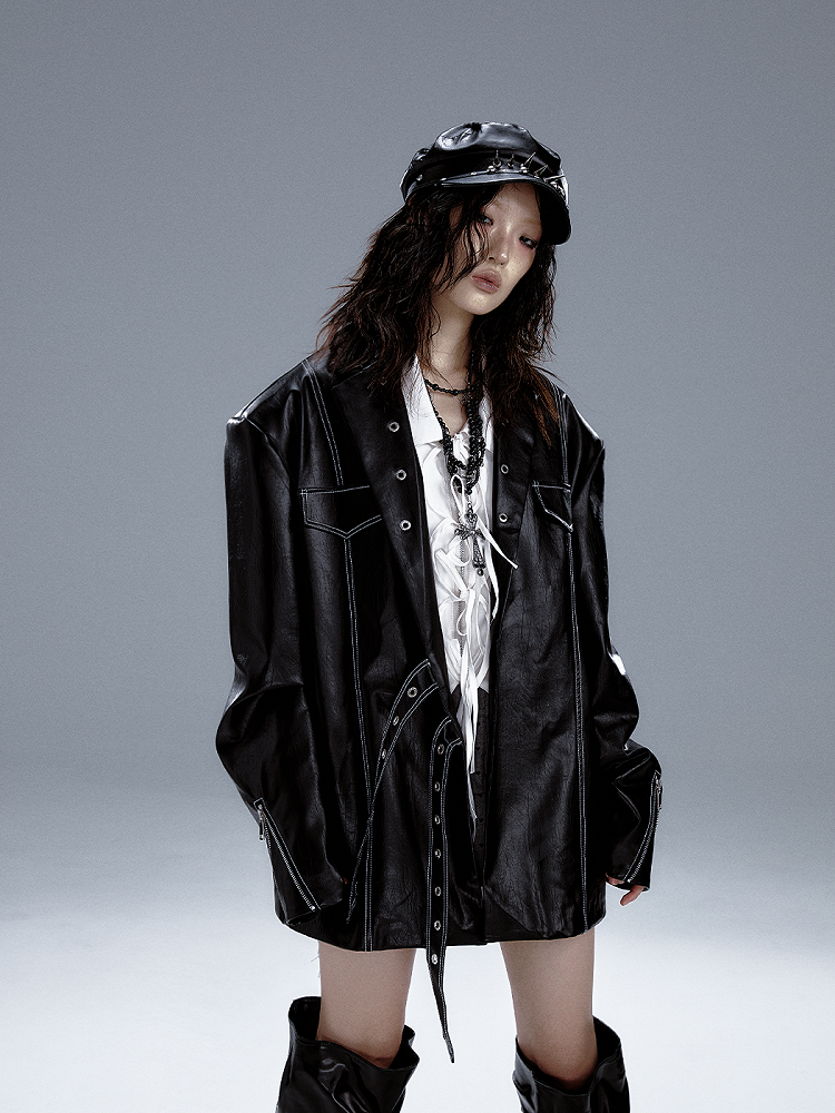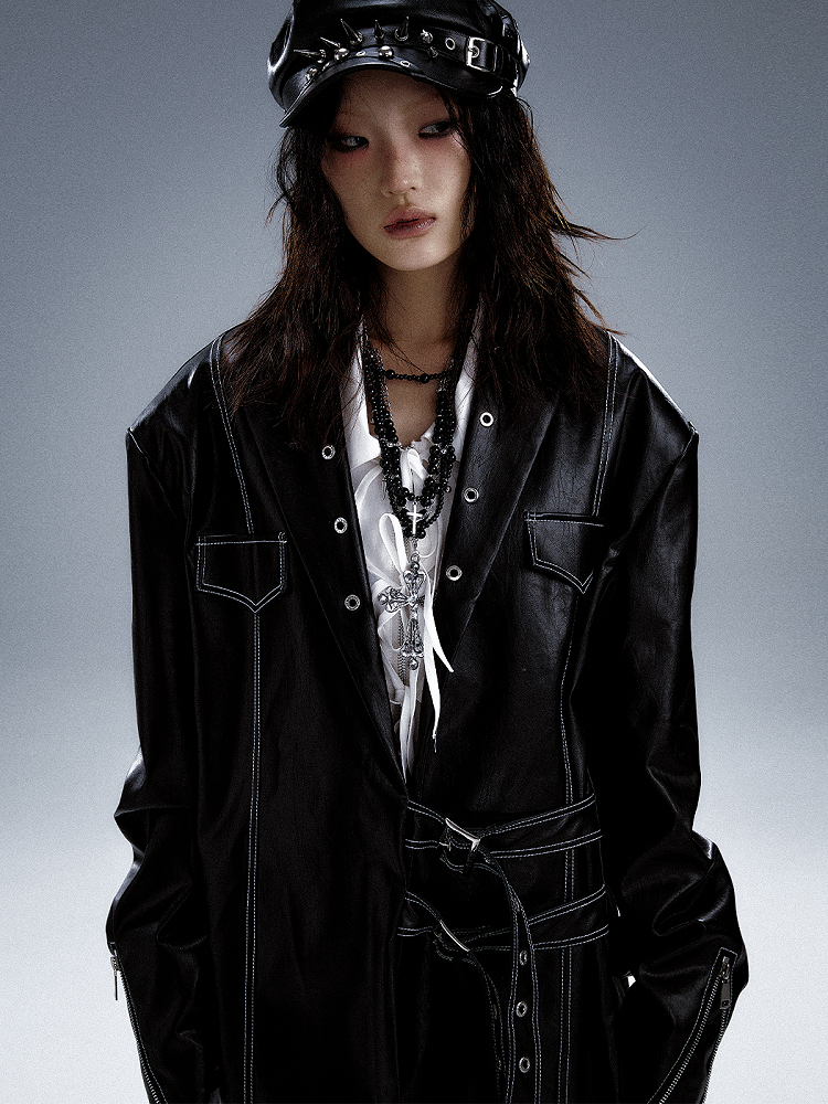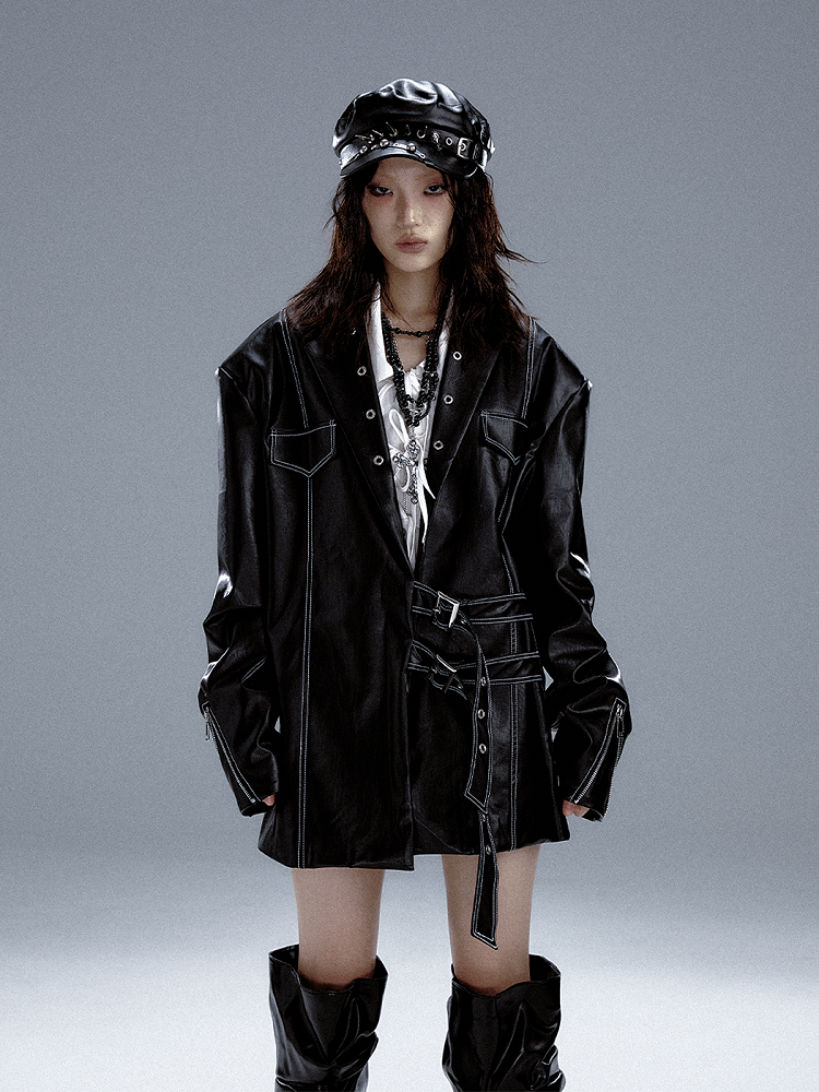 Schwarzer Punk-PU-Anzug mit Metalldetails und Manschetten im Reißverschlussdesign