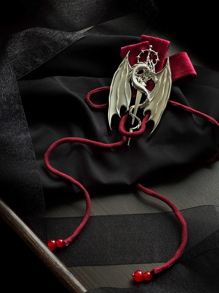 Diese bezaubernde Metallbrosche mit Drachen und Schwert besticht durch einen auffälligen roten Riemen. Perfekt, um jedem Outfit einen Hauch von Verspieltheit zu verleihen – ein Blickfang und einzigartig zugleich. Das filigrane Metalldesign unterstreicht die feine Balance aus Stärke und Schönheit, die Drachen repräsentieren.