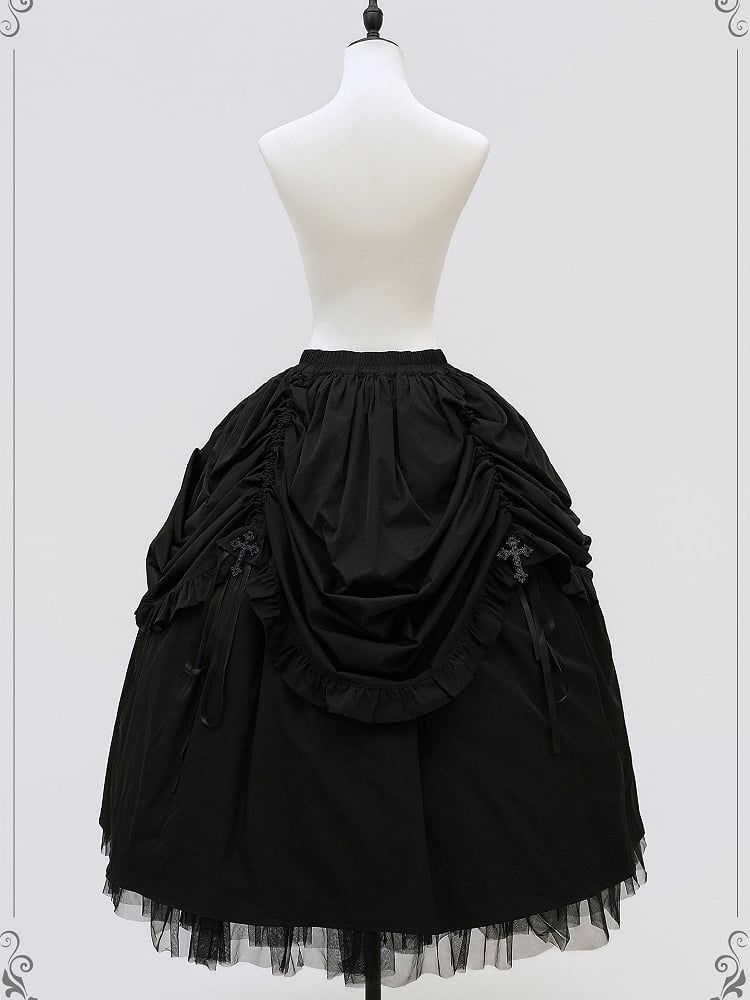 Black Gothic Lolita Layered Skirt with Elastic Waist and Drawstring Design