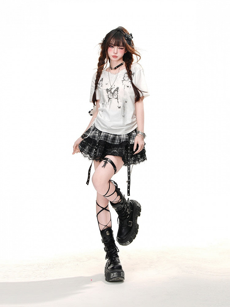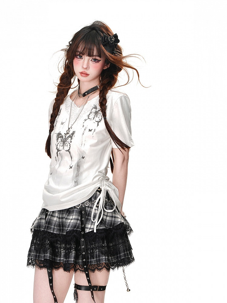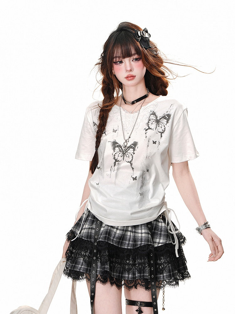 Weißes T-Shirt mit Schmetterlingsdruck und Kordelzug in der Taille und Schmetterlingsdesign am Ausschnitt