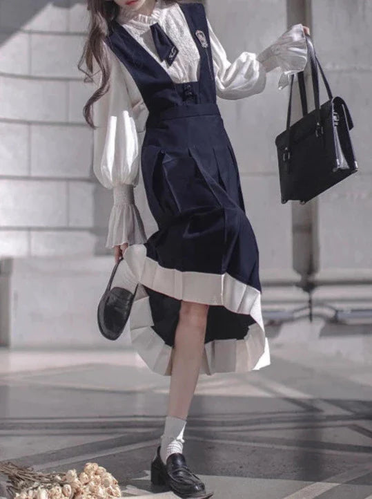 Kleid Emblem + Krawatte + Bluse + Rüsche Retro College Baskenmütze Cyan Stil Elegant Chiffon