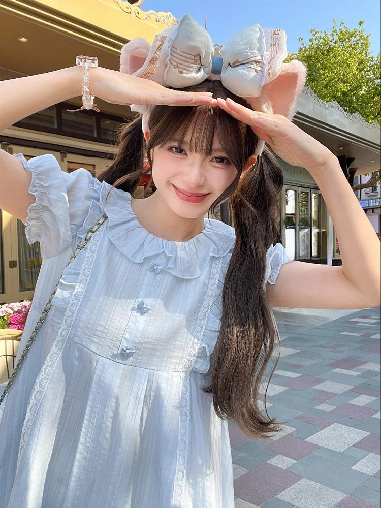 Hellblaues süßes Kleid mit Rüschenkragen und Puffärmeln