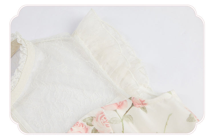 Kleid Rosa Print Rosette Weiß Illusion Lolita Sommer Ausschnitt