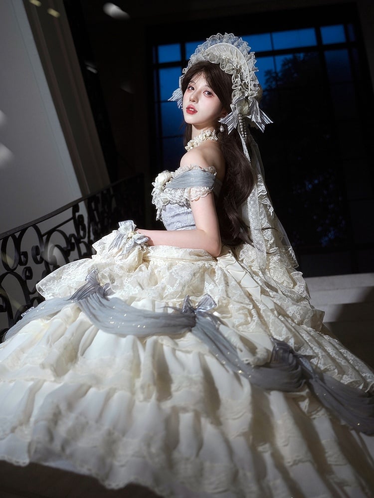 Blau-weißes Old School Lolita Fashion Kleid mit Schleife und Details, JSK-Set