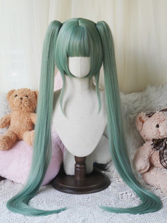 Staubig grüne Bob-Kurzperücke mit Pony+Doppelte gerade Pferdeschwanz-Krallenclips