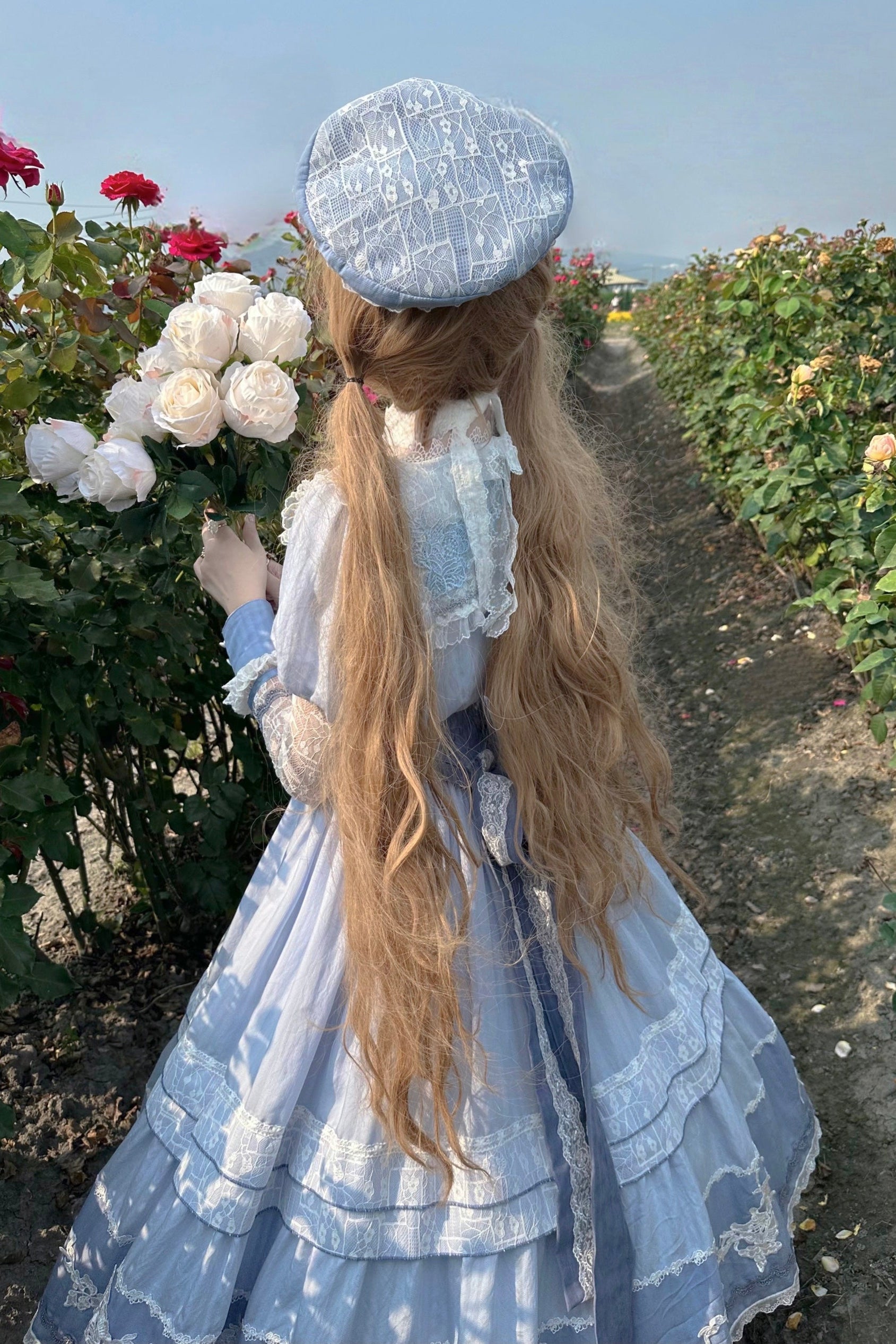 Blau-weißes Old School Lolita Fashion Kleid mit Schleife und Details, JSK-Set