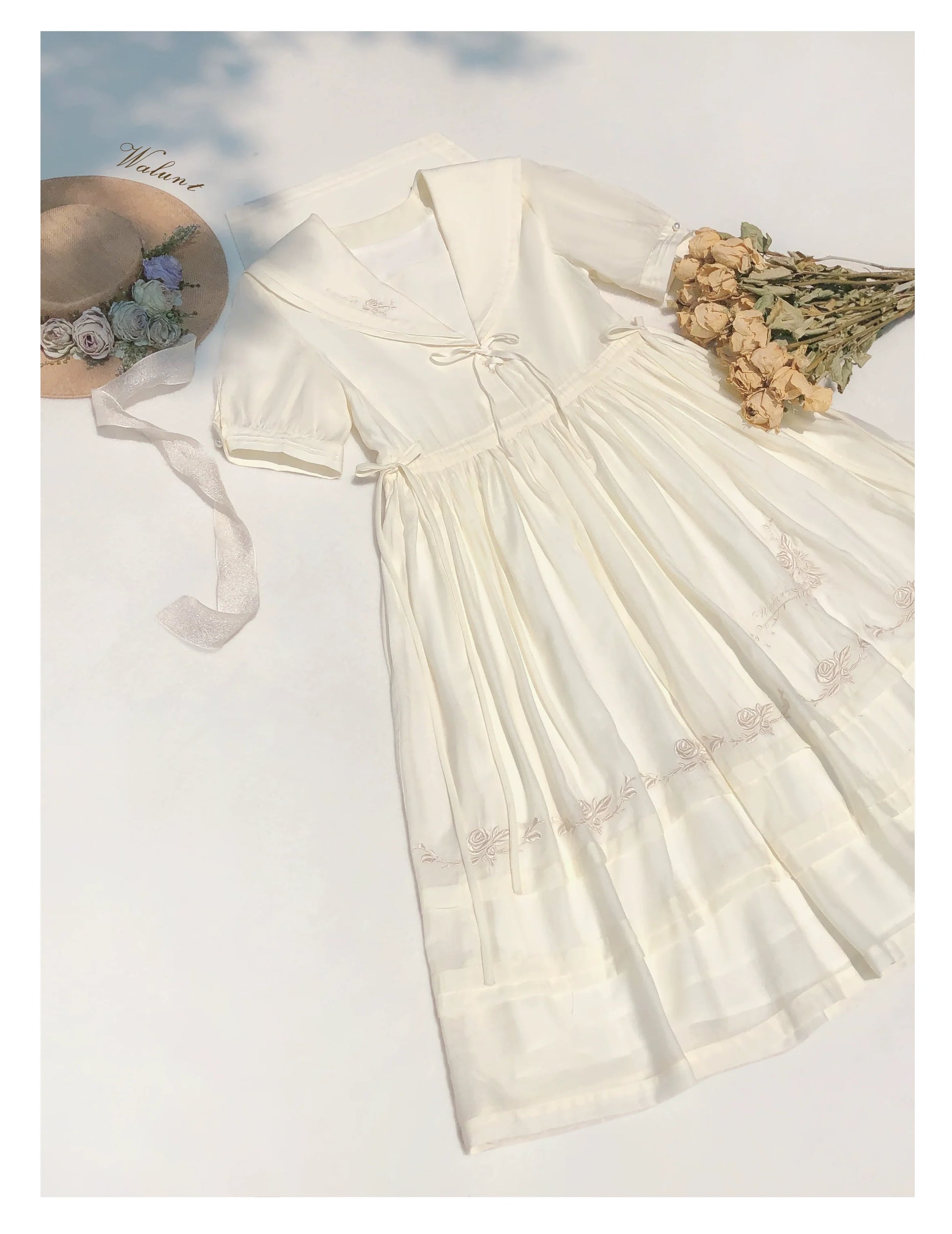 Dieses bezaubernde Kleid besticht durch zarte Rosenstickereien, einen Matrosenkragen aus Tüll und einen Taillengürtel. Der Rock über dem Oberteil mit Kragen sorgt für einen natürlichen, märchenhaften Look. Verleihen Sie jedem Anlass mit diesem schönen Kleid einen Hauch von Eleganz.
