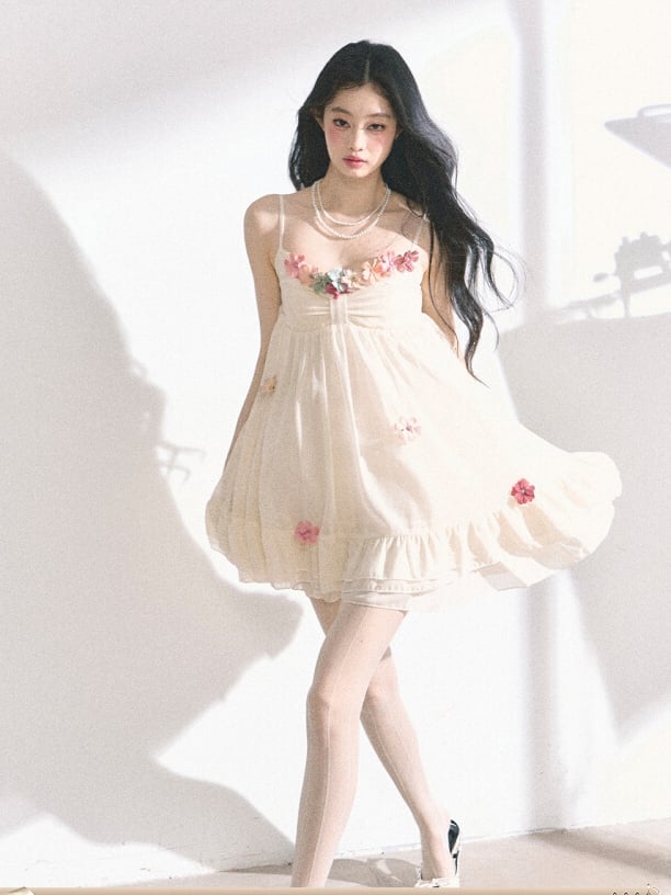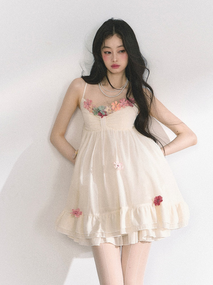 Empire-Taille, floraler Ausschnitt, gestufter Rüschensaum, Urlaubs-Camisole-Kleid, Aprikose, verziert