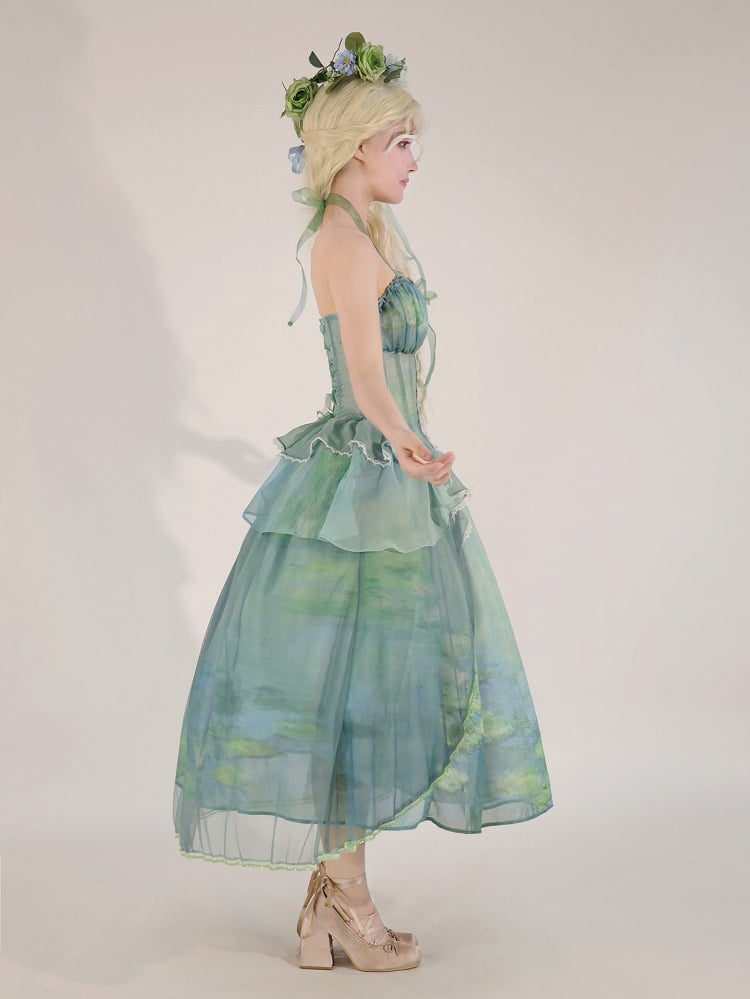 Korsett-Oberteil mit Neckholder und Stäbchen, grünem Feen-Ölgemälde-Druck und gestuftem Volantsaum