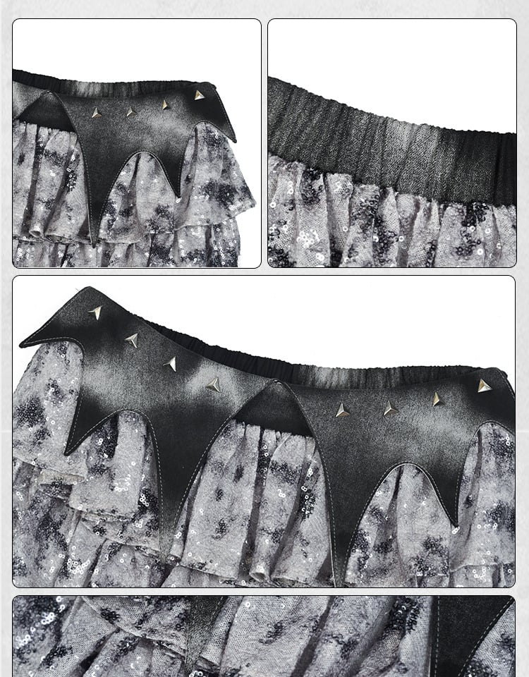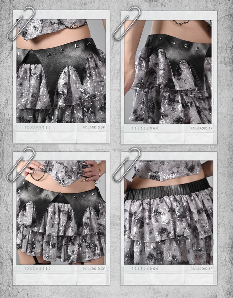 Modischer Bundrock mit niedriger Y3K-Taille, Fledermausflügel-Detail, Pailletten, abgestuft, Cyberpunk, futuristisch, Silbergrau