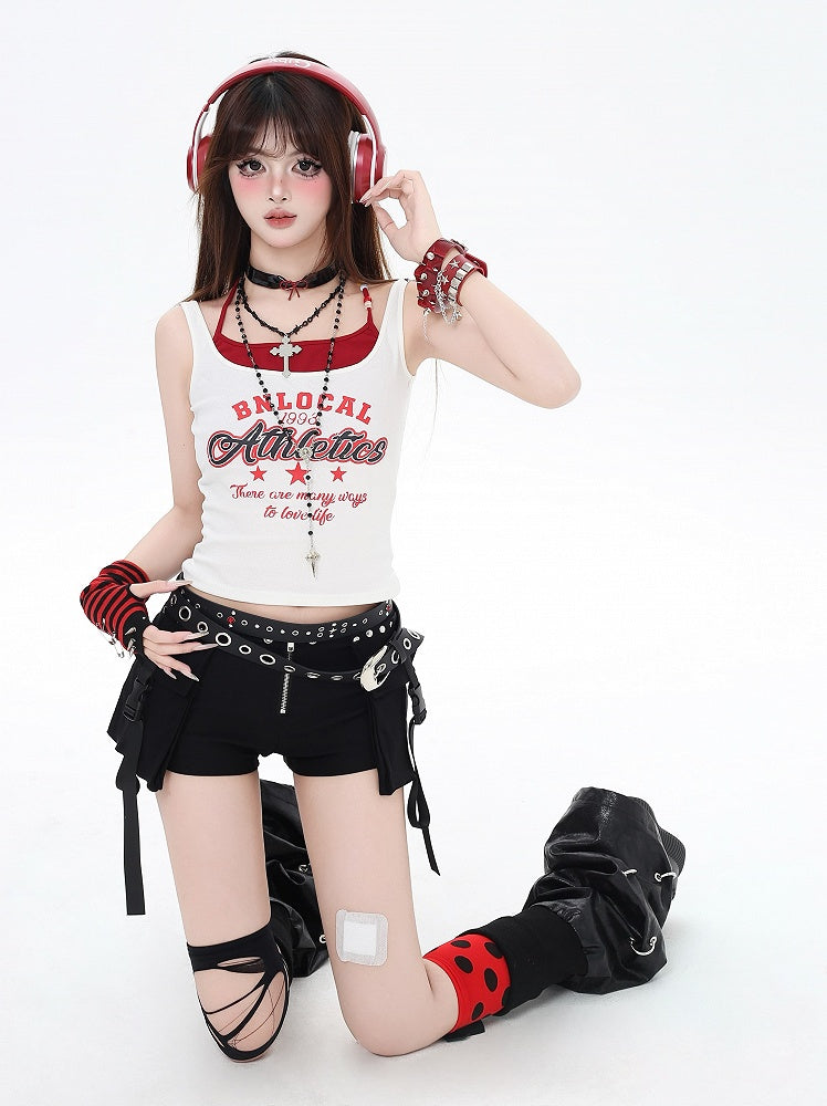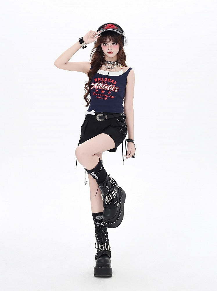 Marineblau/Weiß & Rot Buchstabendruck Vintage Glamouröses Tanktop Faux Zweiteiler