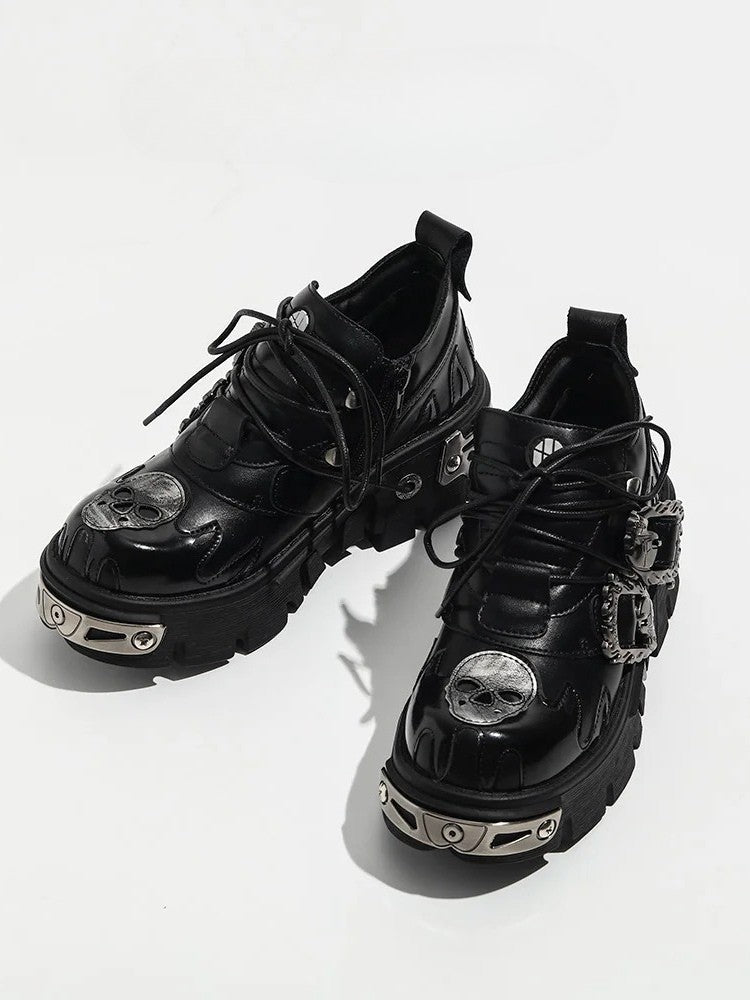 Punk Black Platform Shoes - Skeleton And Flame Detailing & Lace-Up Closure with Skeleton Detail Buckles