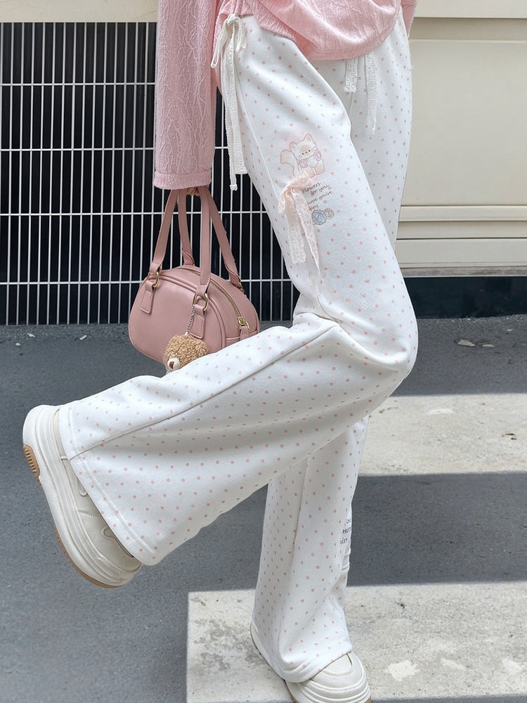Schlaghose mit gepunkteter Spitze und Schleife, entzückendes Kätzchen-Print, Version Normal/Lang, Rosa, Weiß