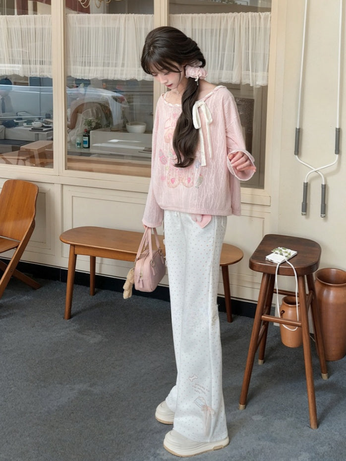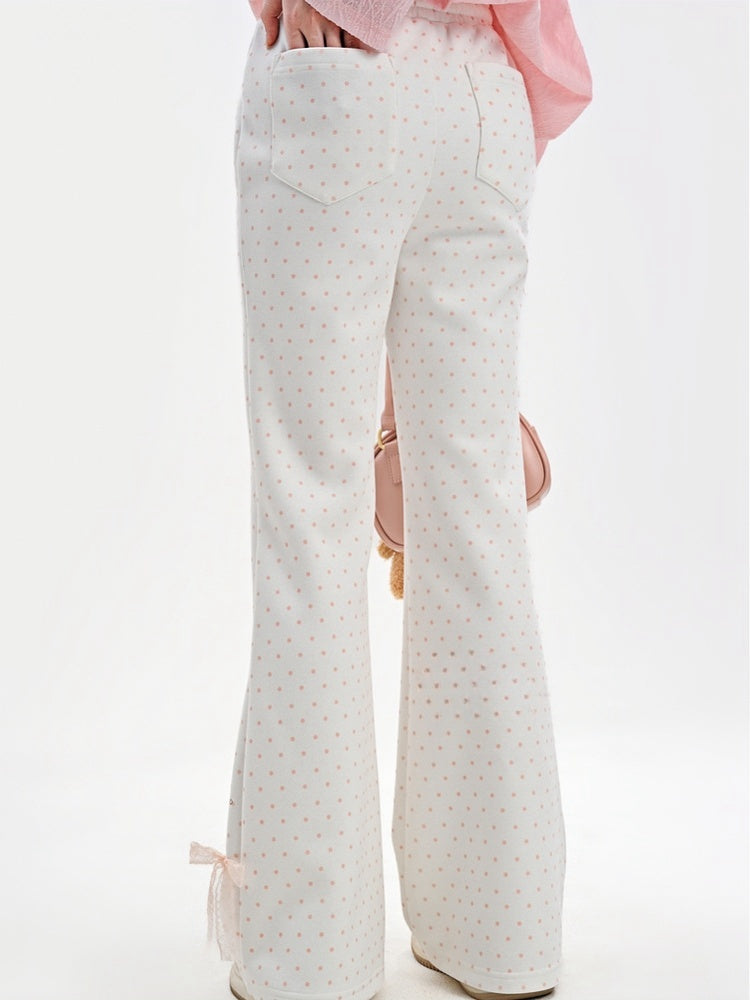 Rosa gepunktete Spitzenschleife, entzückender Kätzchendruck, weiße Schlaghose, normale/lange Version