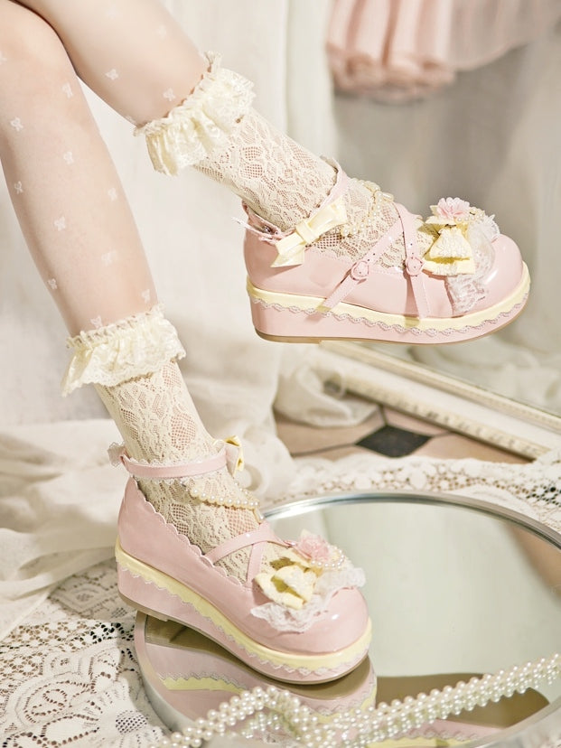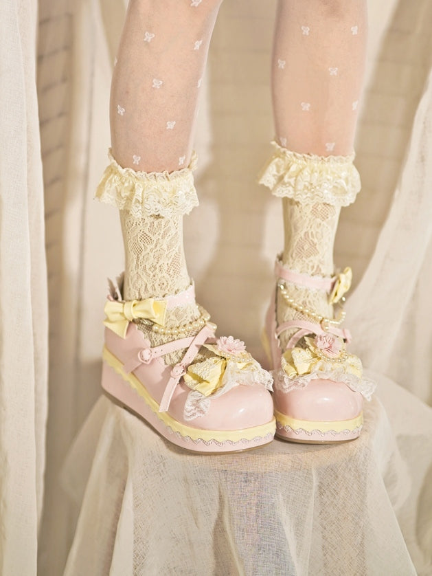 Rosa Schleife mit Blumenmuster oben, Plateauschuhe mit Spitzenbesatz und Herzschnalle und abnehmbarer Perlenkette